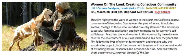 Screening of Women On The Land — a look at the challenges and successes of women from the local Mendocino Coast community who over the last 40 years developed a model for self-sufficiency and an environmentally friendly way to farm our land. Filmmakers Laurie York and Carmen Goodyear will appear at the showing and a discussion with other local farmers will follow the screening.
